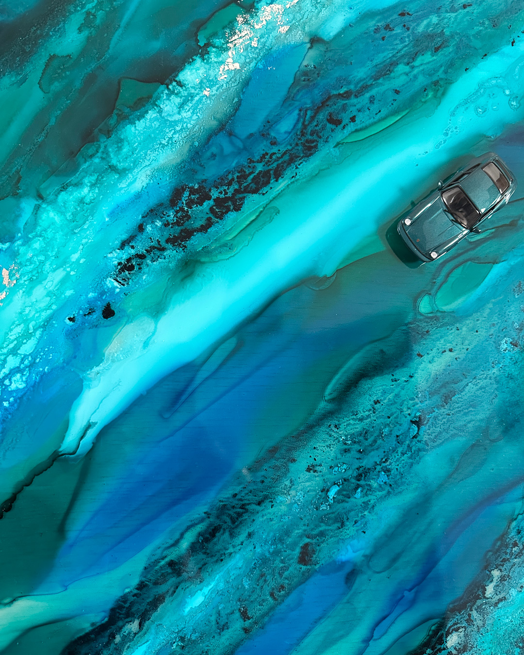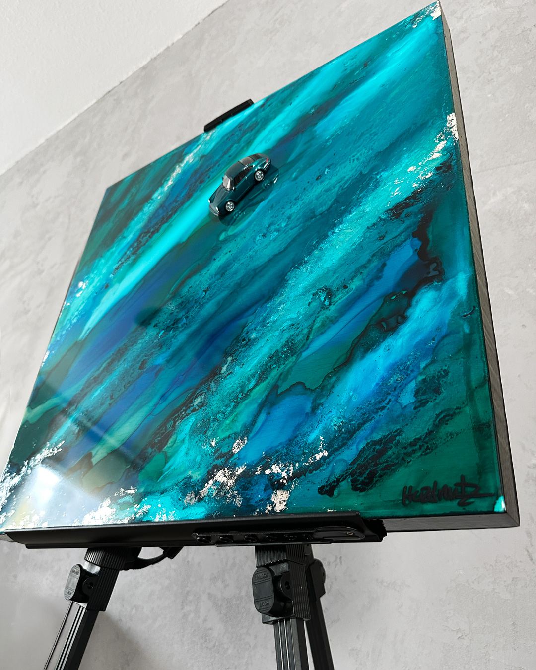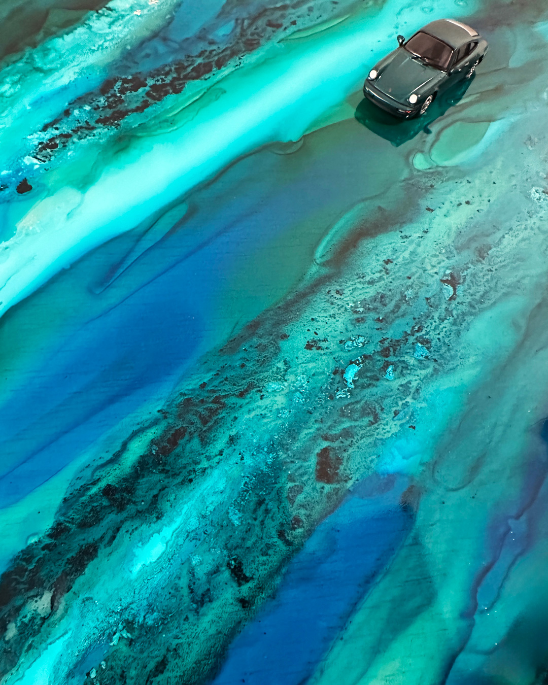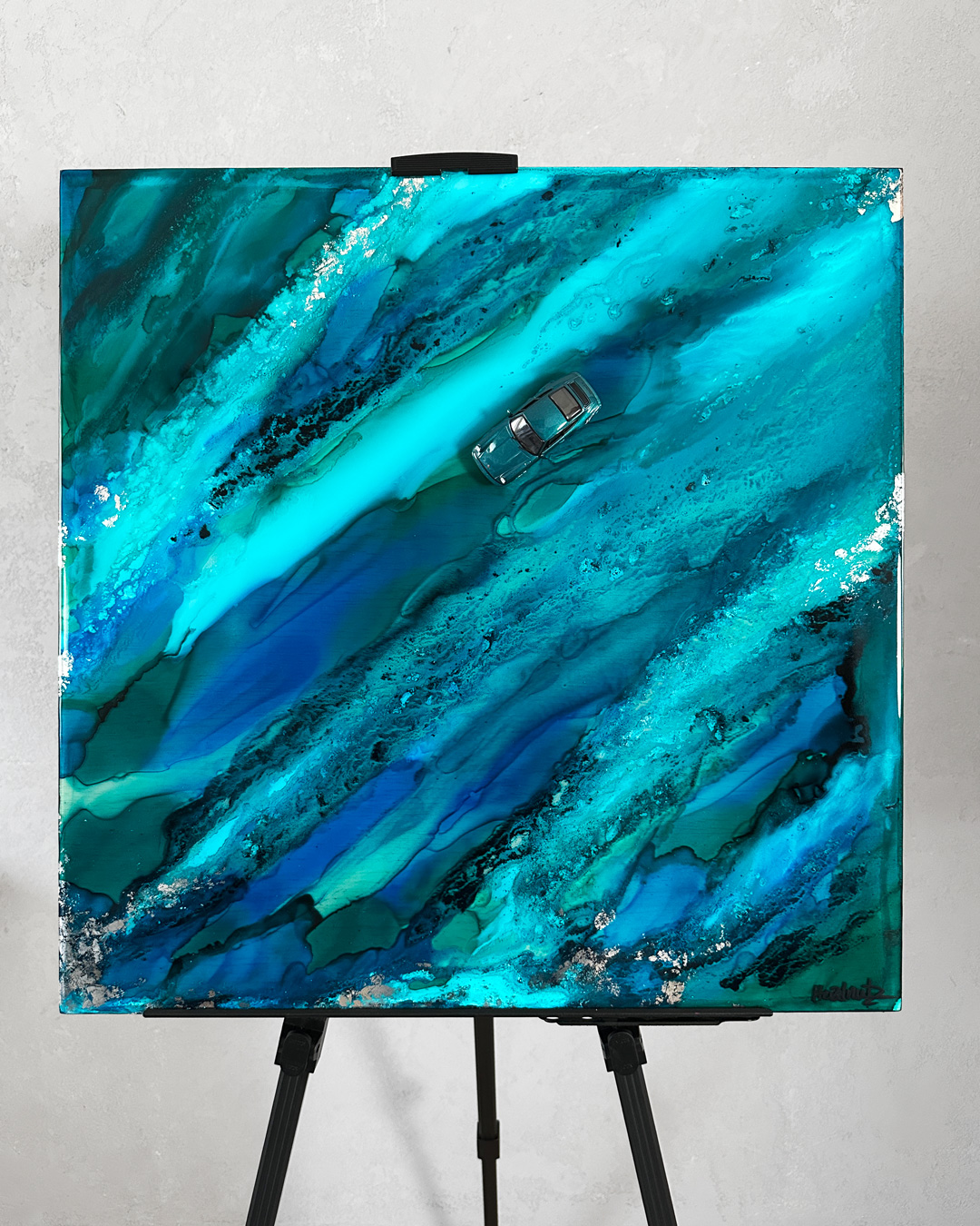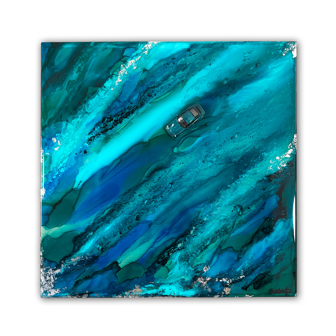 „Orbit Road“ ist ein faszinierendes Mixed-Media-Kunstwerk, bei dem frei fließende Alkoholtinten eine organische, fast kosmische Landschaft formen – irgendwo zwischen Planetenoberfläche und abstraktem Ozean. Mitten in dieser Szenerie bewegt sich ein kleines Modellauto, ein Porsche 911 (964) Carrera von 1989 in türkis metallic, und wird so zum lebendigen Mittelpunkt der Komposition.