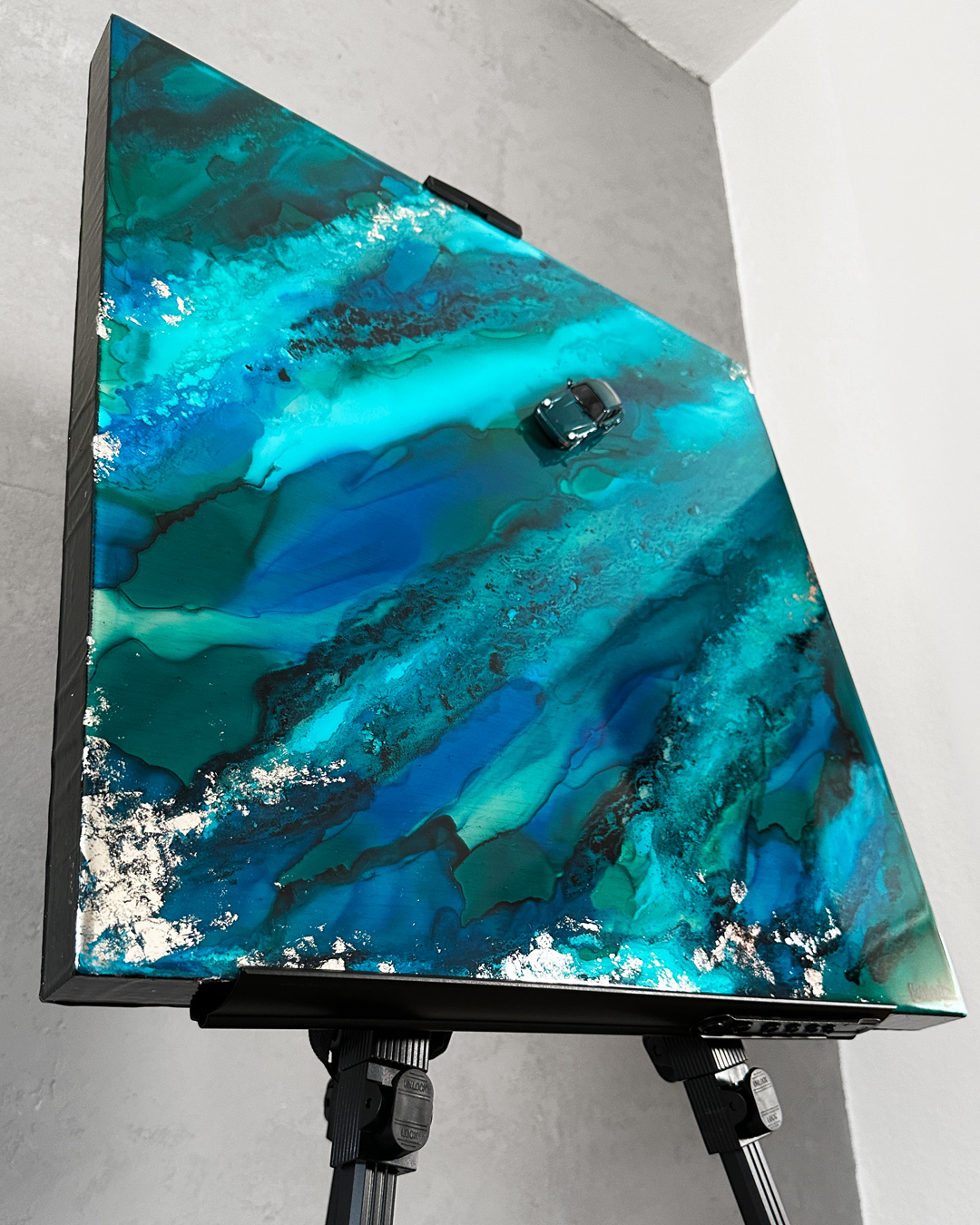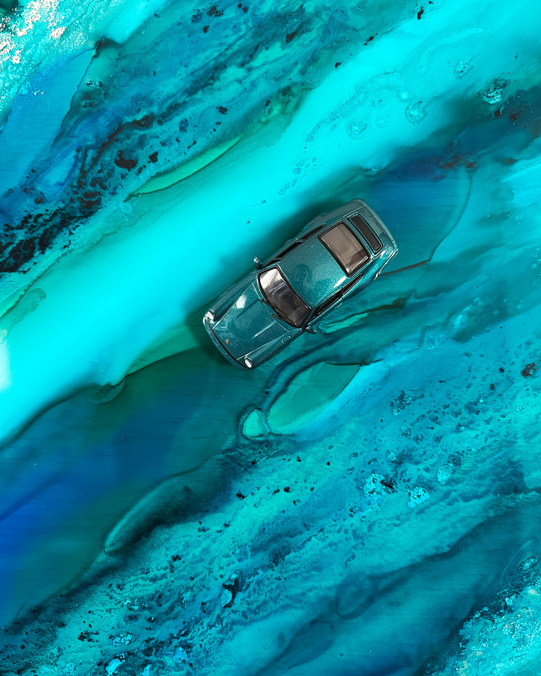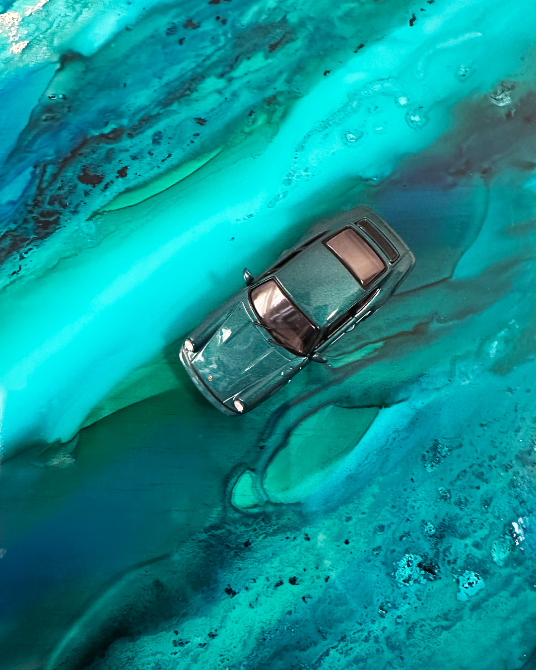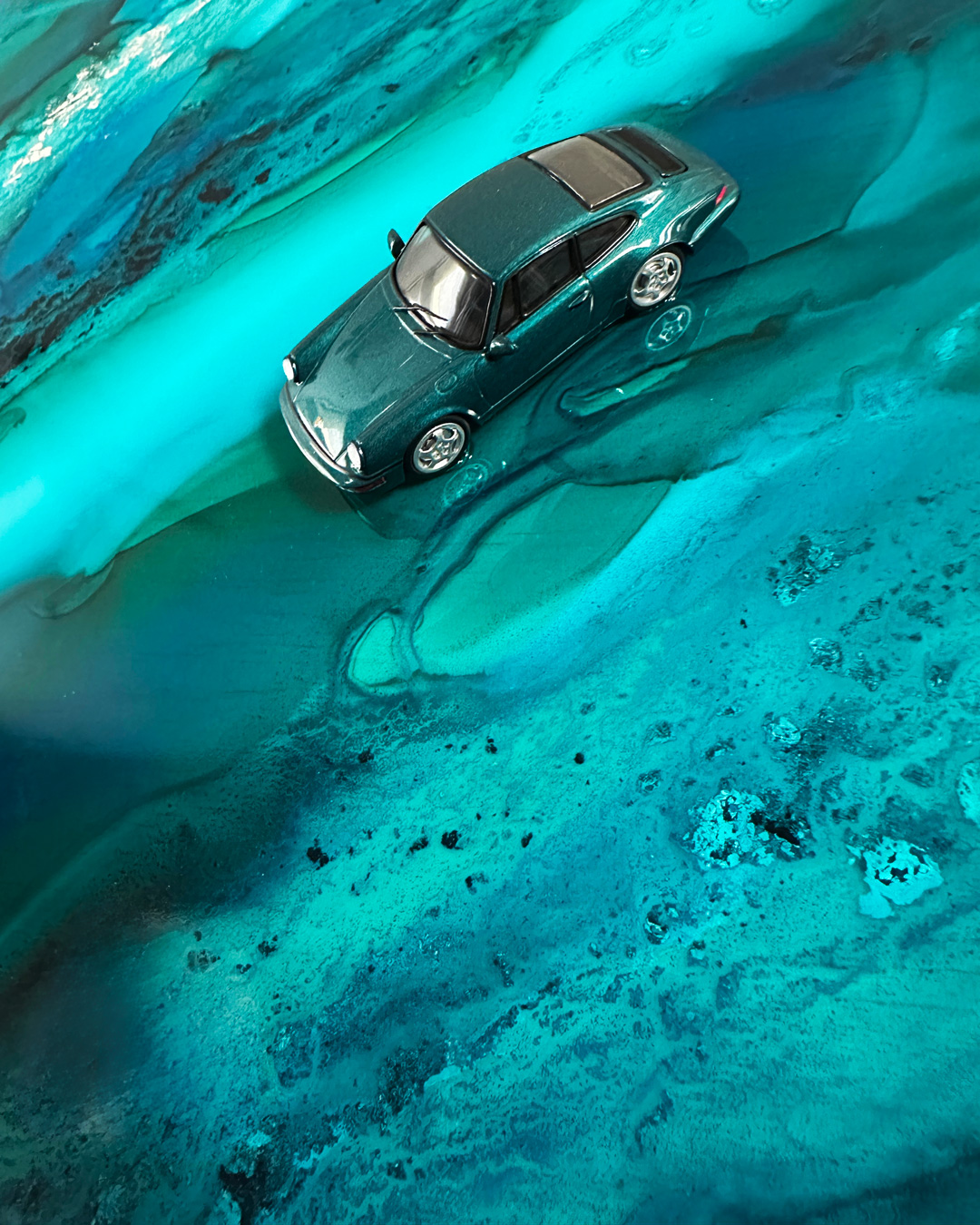 „Orbit Road“ ist ein faszinierendes Mixed-Media-Kunstwerk, bei dem frei fließende Alkoholtinten eine organische, fast kosmische Landschaft formen – irgendwo zwischen Planetenoberfläche und abstraktem Ozean. Mitten in dieser Szenerie bewegt sich ein kleines Modellauto, ein Porsche 911 (964) Carrera von 1989 in türkis metallic, und wird so zum lebendigen Mittelpunkt der Komposition.