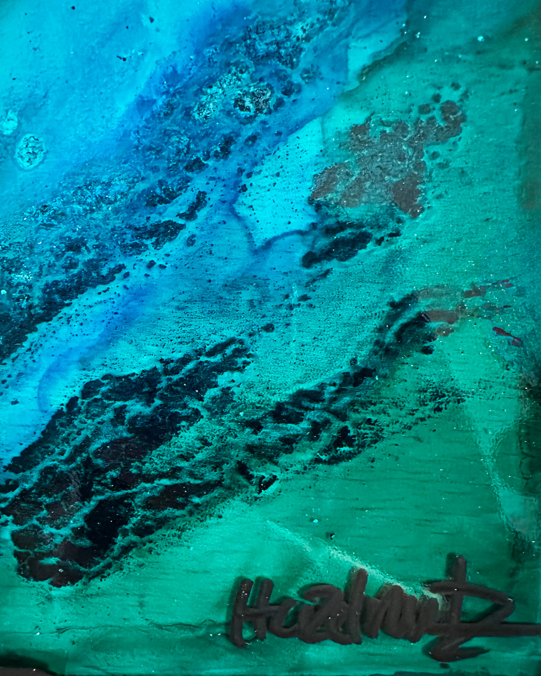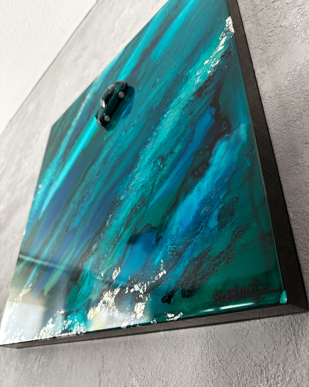 Die abschließende Versiegelung mit Epoxidharz verleiht dem Werk eine außergewöhnliche Tiefe und einen intensiven Glanz, der die Farben zum Leuchten bringt.