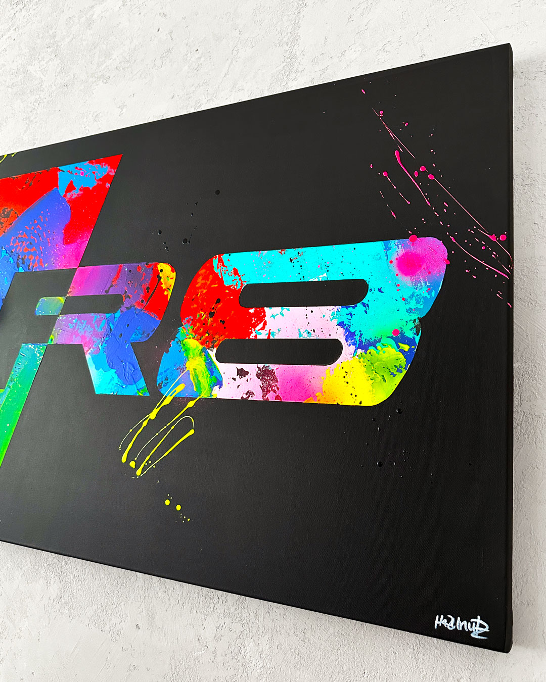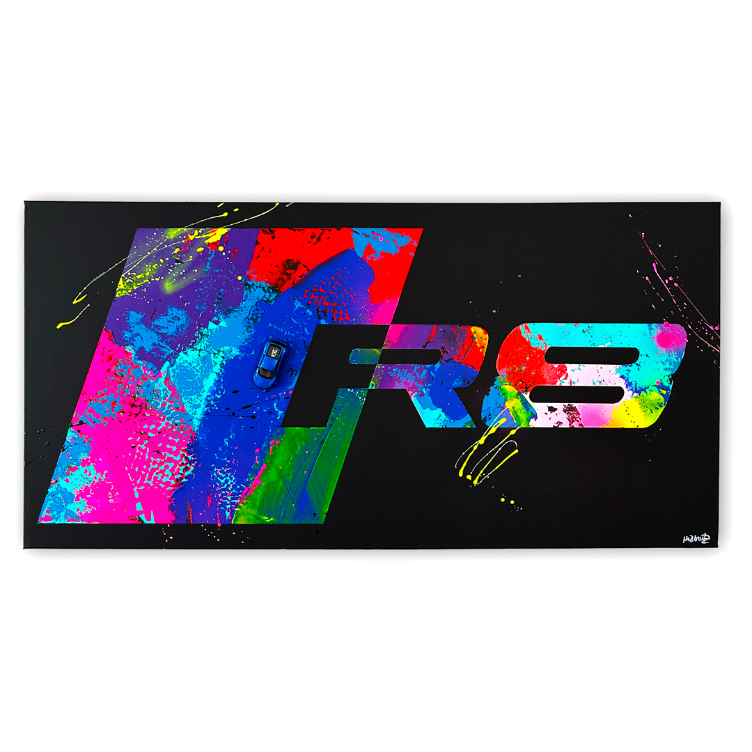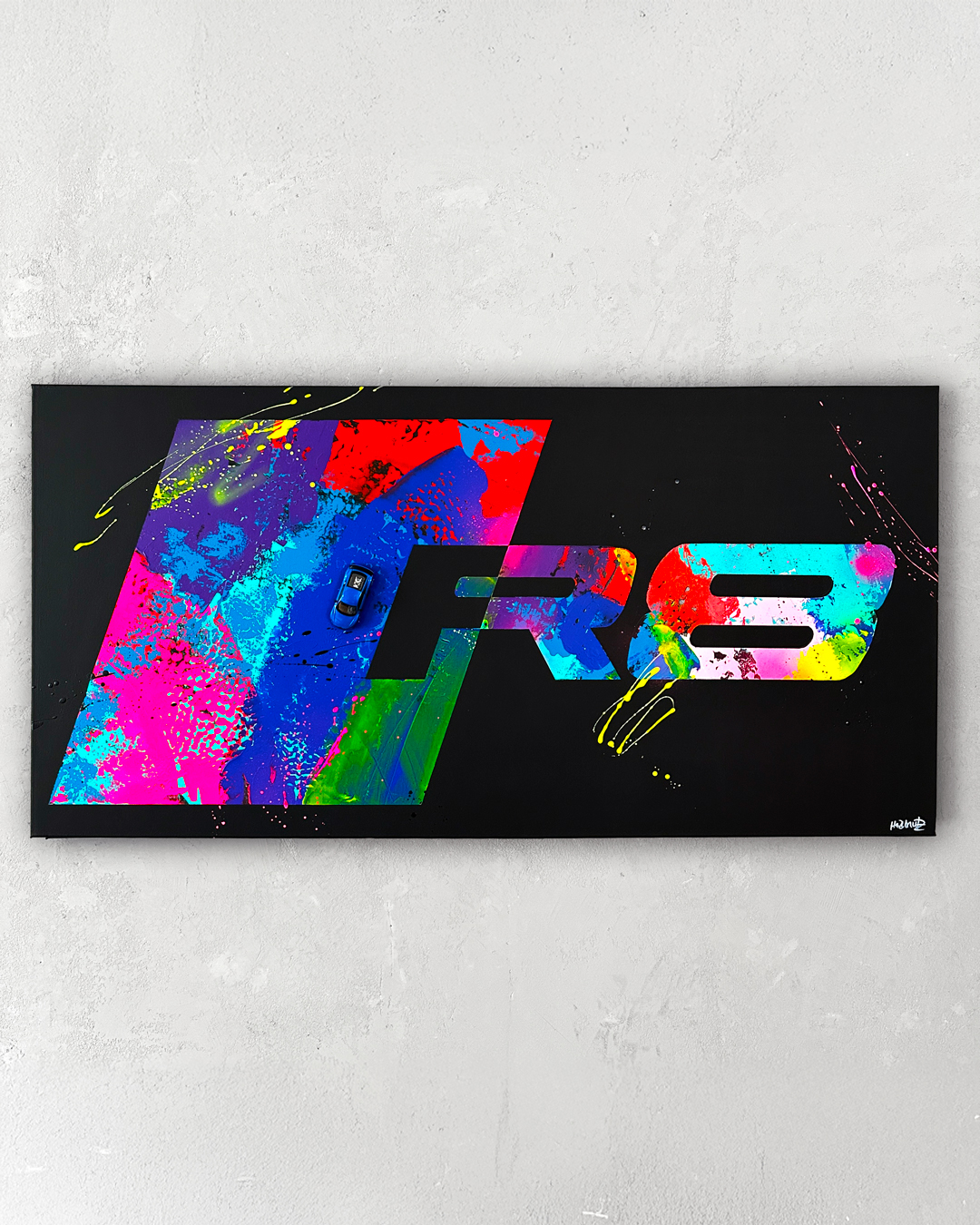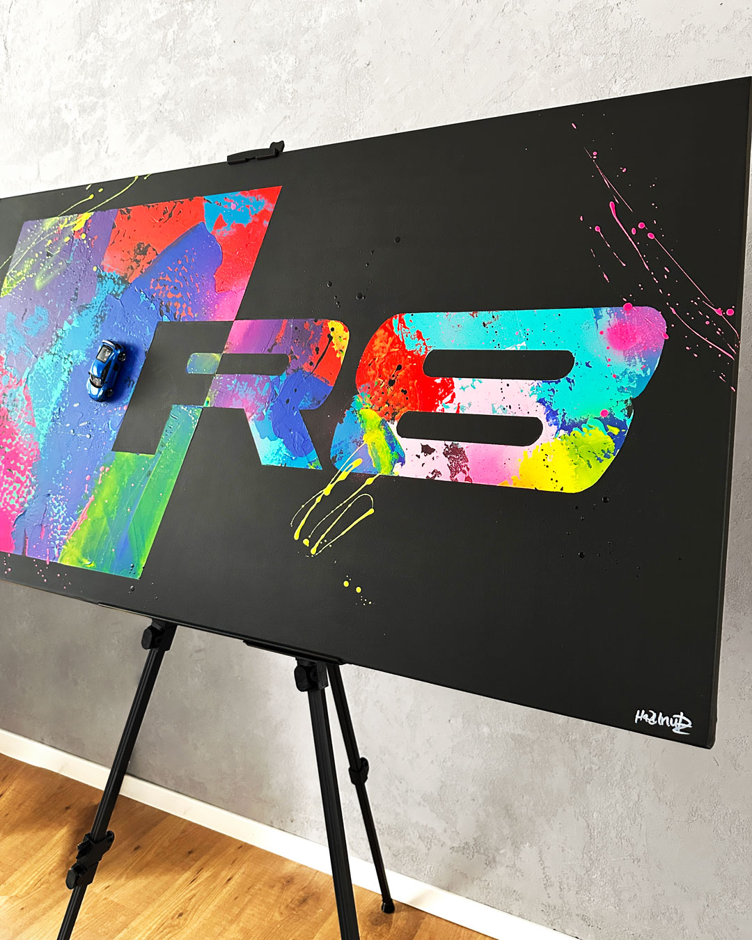 Das Acrylkunst-Projekt „Wild Eight“ ist ein modernes Kunstwerk im Format 140 × 70 cm. Dieses abstrakte Acrylbild kombiniert kraftvolle Neonfarben, dynamische Texturen und ein ikonisches Designobjekt: den Audi R8. Das charakteristische R8-Logo durchbricht ein leuchtendes Farbfeld aus Strukturpaste, Spachteltechnik und Spray – ein Spiel zwischen präziser Geometrie und freiem künstlerischem Ausdruck. Dieses Acrylbild mit Neonfarben steht für pure Energie auf Leinwand. Ein besonderes Detail: Ein integriertes Modellauto des Audi R8 im Maßstab 1:43. Es symbolisiert Geschwindigkeit, Design und Technik und verbindet so automobile Ästhetik mit moderner Acrylmalerei. „Wild Eight“ ist mehr als ein Kunstwerk – es ist eine Hommage an kraftvolle Farben, mutige Kompositionen und das Zusammenspiel von Kontrolle und Kreativität.