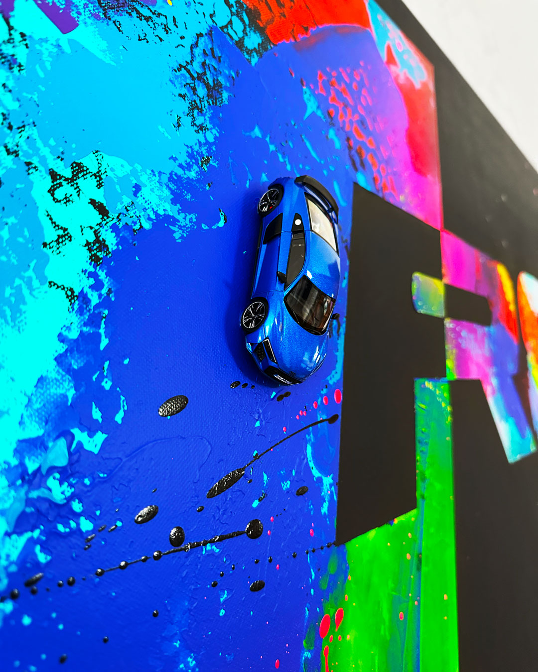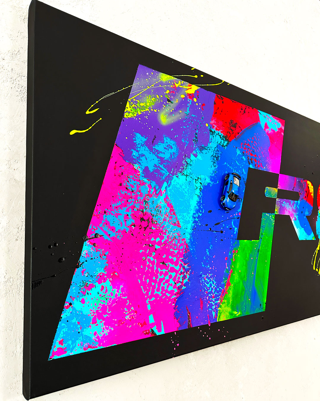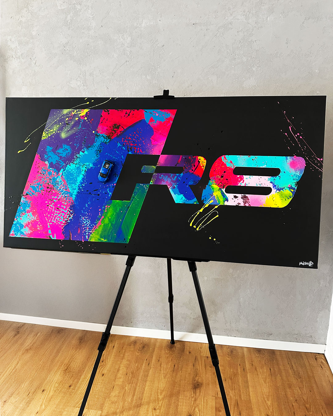 Das Acrylkunst-Projekt „Wild Eight“ ist ein modernes Kunstwerk im Format 140 × 70 cm. Dieses abstrakte Acrylbild kombiniert kraftvolle Neonfarben, dynamische Texturen und ein ikonisches Designobjekt: den Audi R8. Das charakteristische R8-Logo durchbricht ein leuchtendes Farbfeld aus Strukturpaste, Spachteltechnik und Spray – ein Spiel zwischen präziser Geometrie und freiem künstlerischem Ausdruck. Dieses Acrylbild mit Neonfarben steht für pure Energie auf Leinwand. Ein besonderes Detail: Ein integriertes Modellauto des Audi R8 im Maßstab 1:43. Es symbolisiert Geschwindigkeit, Design und Technik und verbindet so automobile Ästhetik mit moderner Acrylmalerei. „Wild Eight“ ist mehr als ein Kunstwerk – es ist eine Hommage an kraftvolle Farben, mutige Kompositionen und das Zusammenspiel von Kontrolle und Kreativität.